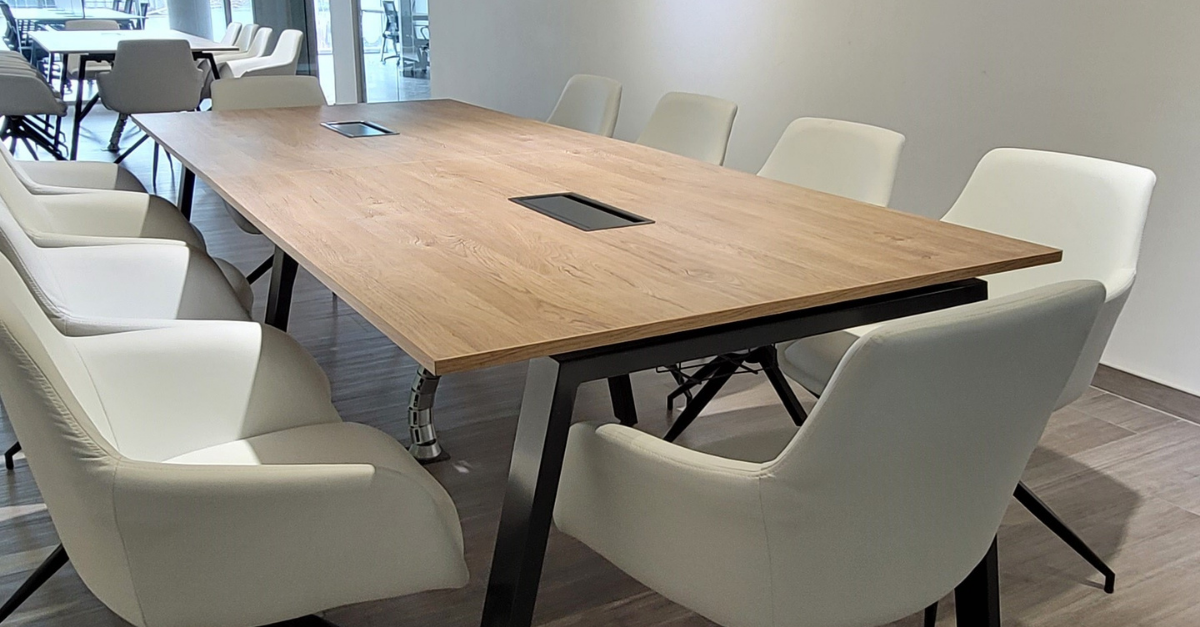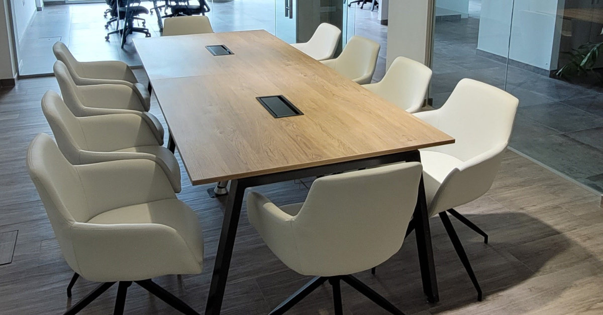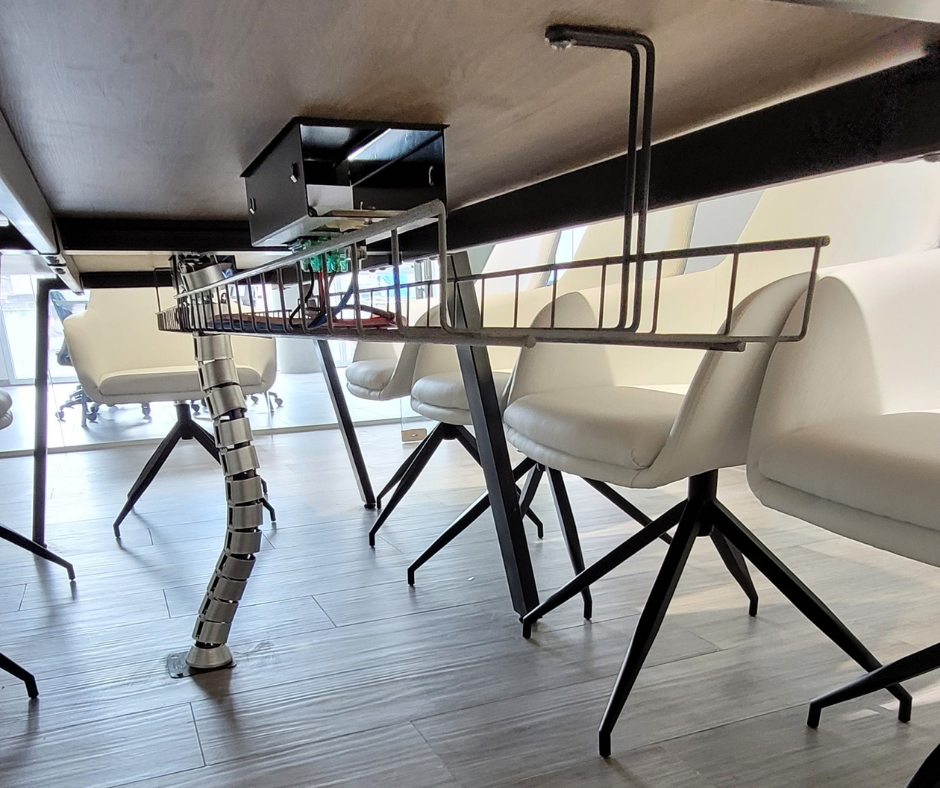 En Materyn sabemos que una buena sala de reuniones corporativa también debe ofrecer soluciones tecnológicas que faciliten el trabajo. Por eso, cada mesa fue equipada con tapas pasacables y cajas de conexión integradas, optimizando la gestión del cableado de forma segura y estética.